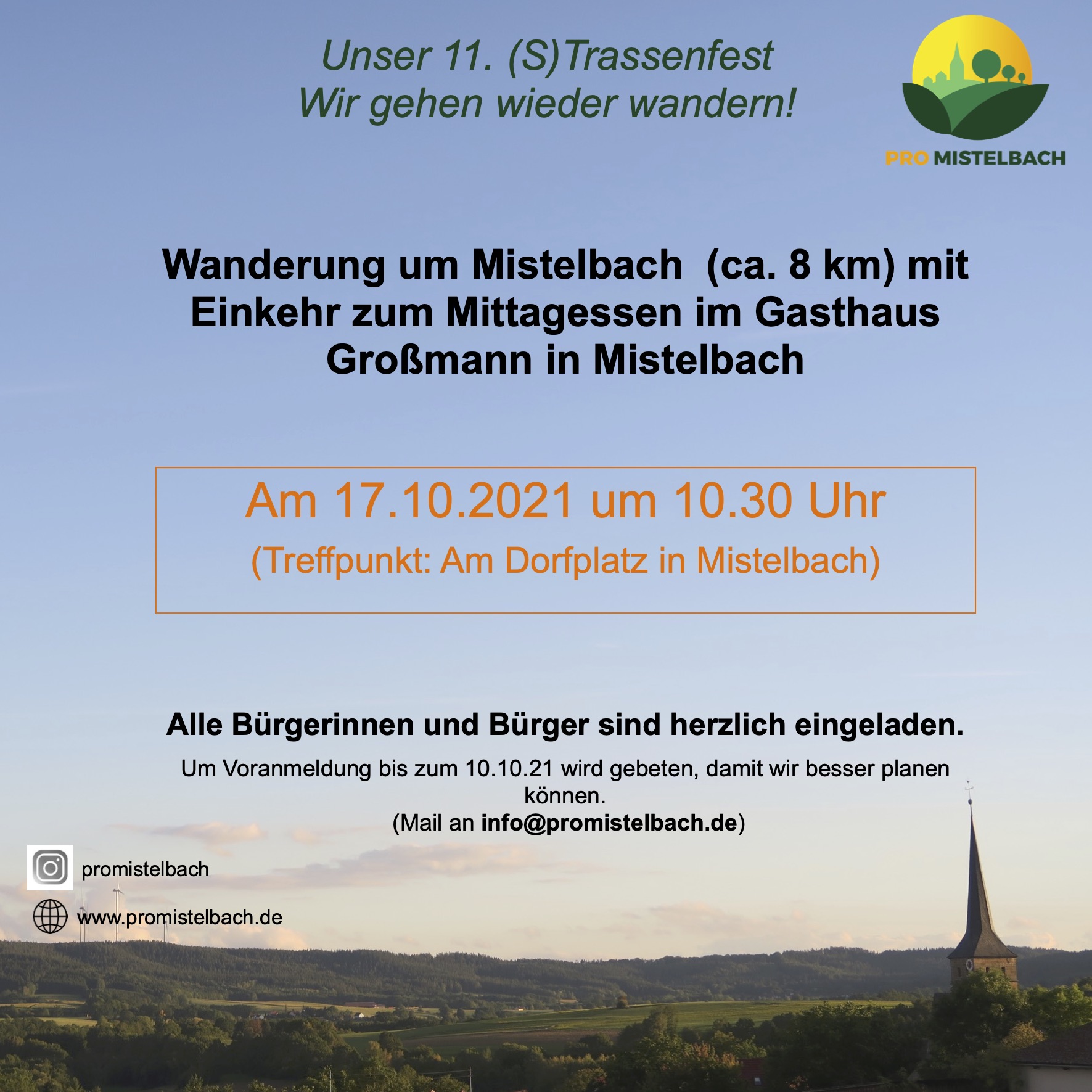 Statt unserem alljährlichen Straßenfest gehen wir wie letztes Jahr wieder wandern. Diesmal geht es rund um Mistelbach (ca. 8 km), zum Mittagessen kehren wir dann im Gasthaus Großmann in Mistelbach ein. Los gehts am 17.10.21 um 10.30 Uhr am Dorfplatz. Wir freuen uns auf eure Teilnahme! Bitte gebt uns bis zum 10.10.21 Bescheid, damit wir besser planen können (Mail an info@promistelbach.de).